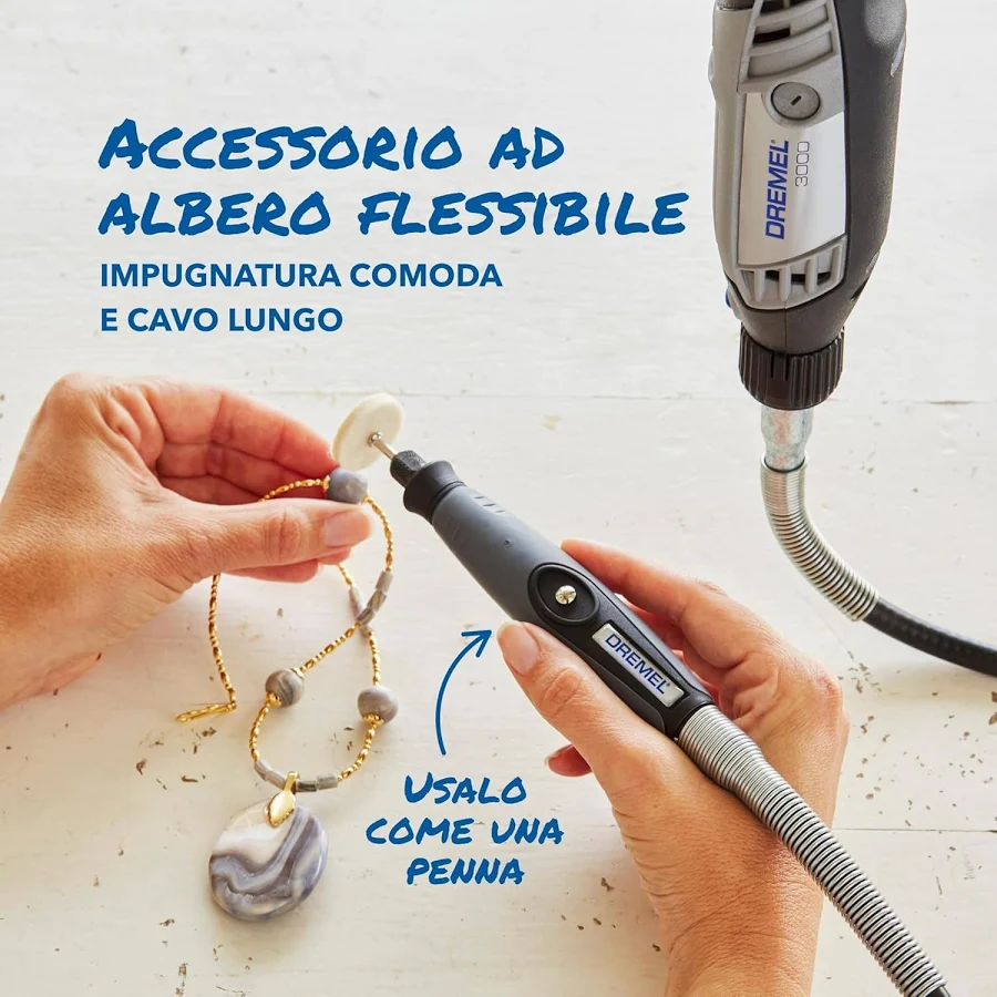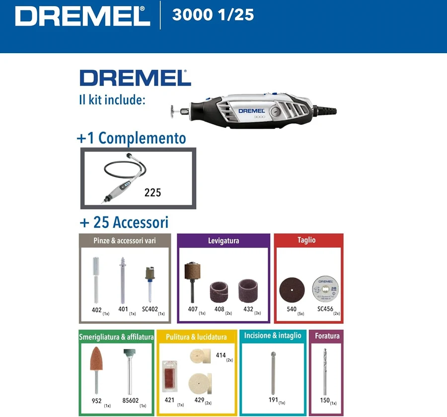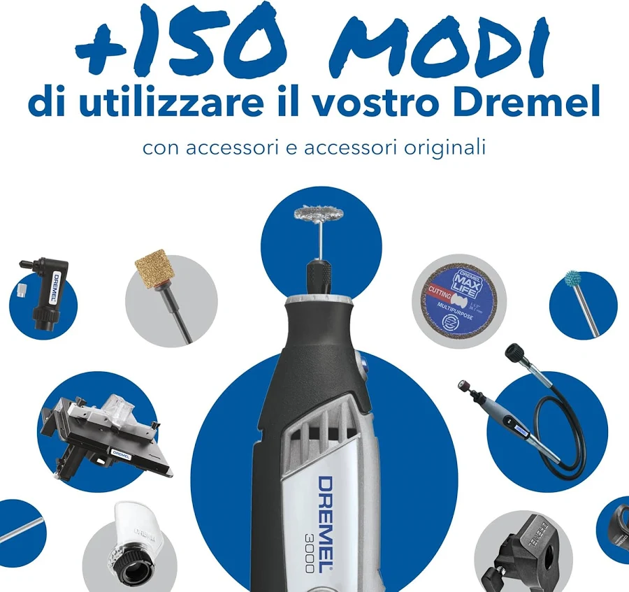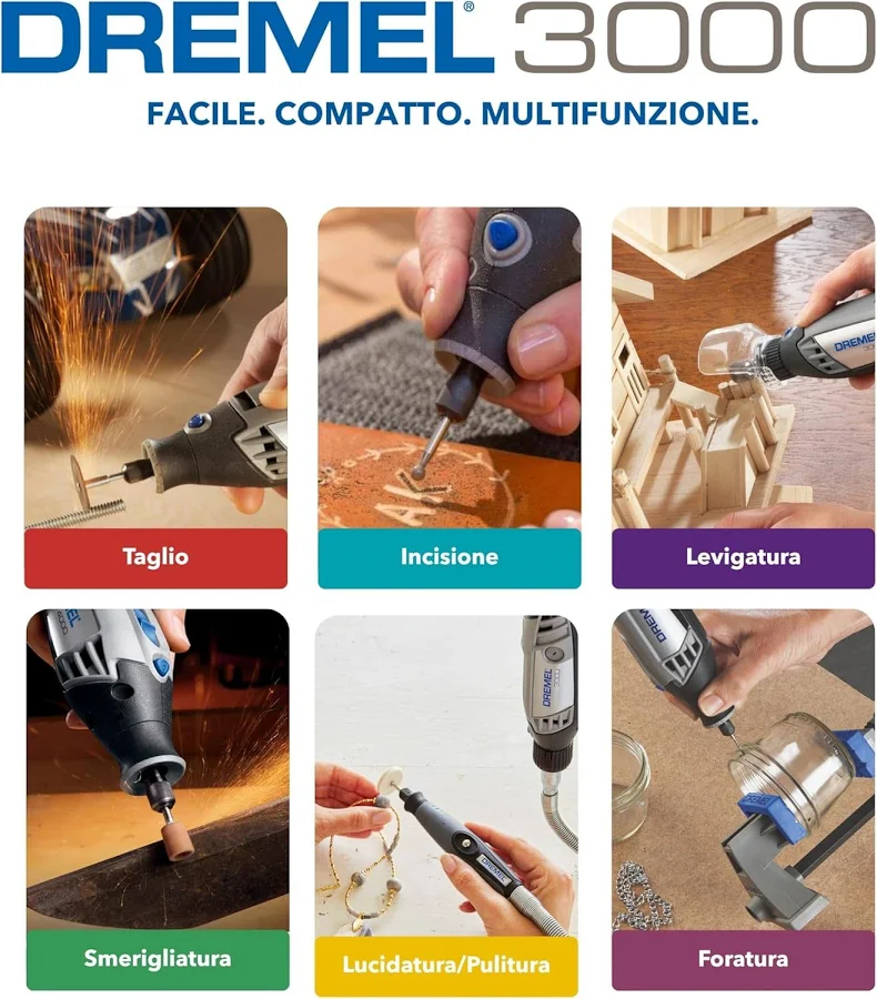 Il Dremel 3000 è il multiutensile ideale per chi desidera precisione, versatilità e comodità in un unico strumento. Grazie ai complementi e accessori intercambiabili, potrai affrontare praticamente qualsiasi lavoro di finitura, modellatura e manutenzione, garantendo risultati professionali anche nei progetti più complessi.